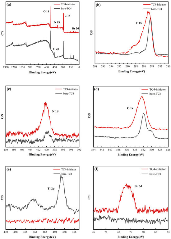 X-ray photoelectron spectroscopy (XPS) was performed to analyze the chemical elements of the titanium alloy surface. Figure 4a shows the XPS spectra of bare-TC4 and TC4-initiator. (b–f) are the spectra of the detected elements. The spectrograms were analyzed, the C 1s peak (b) and O 1s peak (d) were detected on both bare-TC4 and TC4-initiator surfaces. Compared with the TC4-initiator, bare-TC4 has a distinct Ti 2p peak (e) with a peak value of 457.66 eV. In the spectra of TC4-initiator, the Ti 2p peak disappears and exhibits an enhanced N 1s peak (c) along with the appearance of a Br 3d peak (f). The XPS results proved the successful synthesis of the TC4-initiator.