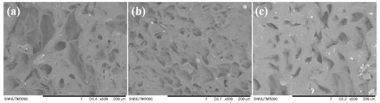 Hydrogels possess three-dimensional network structure that provides the structural basis for drug loading. Figure 6 shows SEM images of gel1 (a), gel2 (b), and gel3 (c) at identical magnification. It can be seen that all gels have a porous structure. As the content of physical crosslinker increases, the number of interaction points in the hydrogel increases, the crosslinking density increases, and the pore size of the gel decreases.