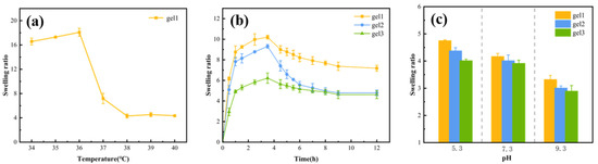 The curve of the equilibrium swelling rate of hydrogel with temperature at different temperatures (a), swelling rate of gels in secondary water at 37 °C (b), and swelling rate of gels at different pH values (c).
