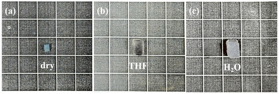 Digital photographs of dried gel (a), gel completely dissolved in THF (b), and gel completely dissolved in secondary distilled water (c).