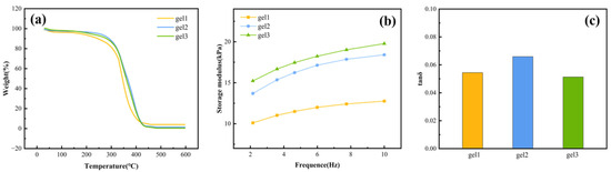 TG diagram of gels (a), energy storage modulus of gels (b), and the loss tangent of gels at a frequency of 10 Hz (c).