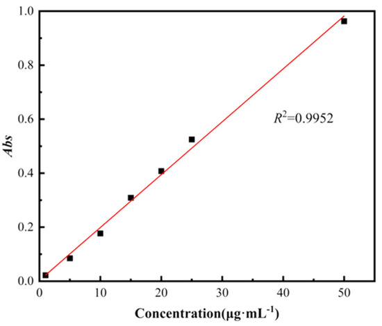 Figure 11 shows the standard curve of Indomethacin solution. The absorbance of different concentrations of Indomethacin solution was tested at the maximum absorption wavelength of 320 nm, using PBS buffer solution at pH = 7.3 as solvent. The standard curve was plotted using the concentration of Indomethacin solution as the horizontal coordinate and absorbance as the vertical coordinate.