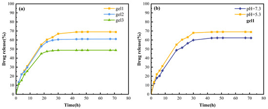 All gels were placed in PBS buffer at T = 37 °C, pH = 5.3 to simulate the physiological parameters of the inflammation site. Figure 12a shows the cumulative drug release rates of the gels. After 72 h, the drug release rates of gel1, gel2, and gel3 were 68.89%, 61.11%, and 48.73%. The drug release rates of the gels were high and showed regular changes. The drug release rate of gels was inversely proportional to the content of physical crosslinker.