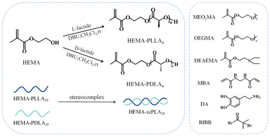 The whole reaction was carried out under N2 atmosphere. D-lactide (4.6 mmol), the initiator HEMA (0.46 mmol) and 25 mL purified DCM were added to a dry three-necked flask. After dissolution of all solids, the catalyst DBU (0.1 mL) was added to the flask. The mixture was stirred at room temperature for 12 h and quenched with benzoic acid (0.1 g). The resultant mixture was transferred to a beaker containing 30 mL of hexane under ice-water bath conditions. Solvent evaporation was performed in the fume hood. The resulting precipitate was the macromonomer HEMA-PDLA20. The synthesis of HEMA-PLLA20 was carried out in agreement with that of HEMA-PDLA20. and only the enantiomer of PLA was changed.
