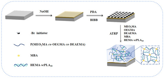Titanium alloy (TC4) was purchased from Shaanxi Baotai Group Co. (Xi’an, China.) Hydroxyethyl methacrylate (HEMA, 99%) and 1,8-diazabicyclo[5.4.0]undec-7-ene (DBU, 98%) were purchased from Beijing Bailing Wei Technology Co. (Beijing, China) L-propylacrylate (L-LA, 98%), 2-(2-methoxyethoxy)ethyl methacrylate (MEO2MA, 97%), oligoet-hylene glycol methacrylate (OEGMA, 95%), and diethylaminoethyl methacrylate (DEAEMA, 99%) were purchased from Shanghai McLean Biochemistry and Technology Co. (Shanghai, China) D-propyllactone (D-LA, 99%) was purchased from Aladdin Chemical Reagent Co. (Shanghai, China) 2-Bromoisobutyl bromide (BIBB, 98%) and triethylamine (TEA, 99%) were purchased from Shanghai Sinopharm Chemical Reagent Co. (Shanghai, China). N,N,N′,N″,N″-Pentameth-yldiethylenetriamine (PMDETA, 98%) and N,N′-methylenebisacrylamide (MBA, 99%) were purchased from TCI (Shanghai Development Co., Ltd. (Shanghai, China)). Dopamine (DA, 95%) was purchased from Wuhan Jiangsu Akcome Biomedical Research and Development Co., Ltd., (Wuhan, China). N,N′-Dimethylformamide (DMF) ultra-dry solvent and tetrahydrofuran (THF) ultra-dry solvent were purchased from Anegi Chemicals Ltd. (Shanghai, China) Dichloromethane (DCM) was purified and the experimental water was secondary distilled water.