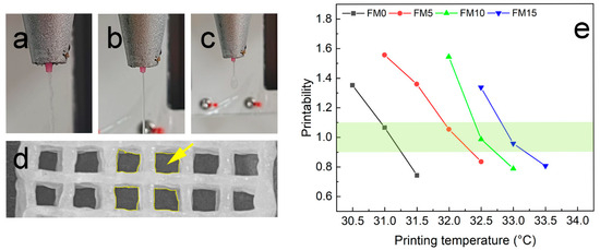 Evaluation the printability of the FG/MCC biomaterial inks: (a–c) shapes of extrudes; (d) pores were selected for calculating ; (e) qualitative characterization of printability.