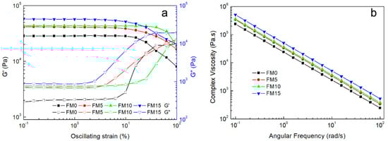 The linear viscoelastic region (LVR), defined by a critical strain or stress threshold at its boundary, is typically identified through amplitude sweep tests. In these tests, the oscillating strain is incrementally increased while maintaining a constant frequency [30]. As shown in Figure 2a, the storage modulus (G′) of most samples remained stable until a rapid decline occurred at approximately 10% oscillation strain, except for FM10, which maintained its G′ until ~20% strain. The inflection point of each curve represents the critical oscillation strain, delineating the LVR boundary [31].