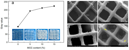 The macroscopic morphology of the printed composite hydrogel scaffold is shown in Figure 3a. The transparent hydrogel exhibits a transition to white opacity (with increased gray values) as MCC content rises. The printing stability and structural consistency of the composite hydrogels are significantly enhanced by MCC incorporation, as confirmed by visual inspection of the printed samples.