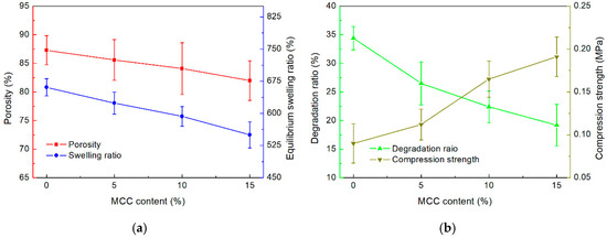 (a) Porosity and equilibrium swelling ratio; and (b) degradation ratio and compression strength of the printed composite scaffold.