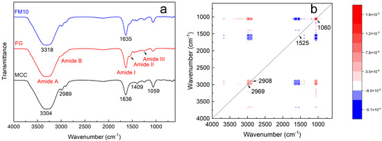 (a) FTIR of FG, MCC, and the FM10 hydrogel composite and (b) 2D synchronous correlation spectroscopy of FG and FM10.