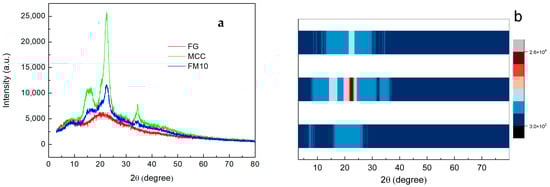 (a) XRD pattern and (b) XRD strip heat map of FG, MCC, and the FM10 hydrogel composite.
