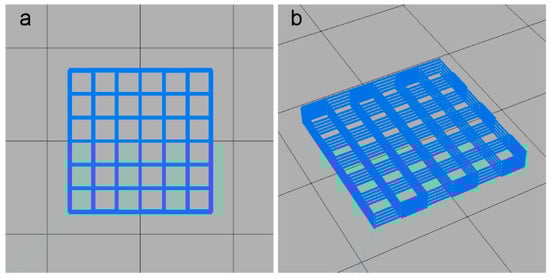 Digital model of the printed cubic scaffold. (a) Top view, and (b) perspective view.