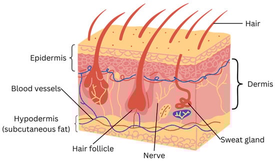 - Lopez-Ojeda, W.; Pandey, A.; Alhajj, M.; Oakley, A.M. Anatomy, Skin (Integument); StatPearls: Treasure Island, FL, USA, 2022. [Google Scholar]