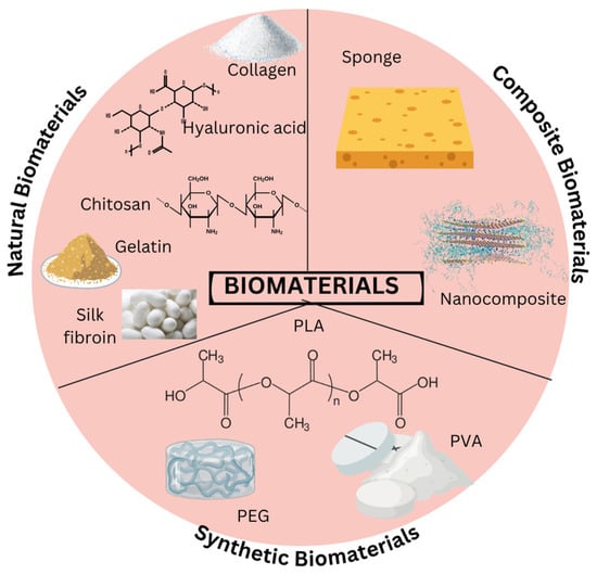 | Natural biomaterials | Collagen | Human and animal ECM (bovine, pig, mouse, marine) | Biocompatible and can be used in 3D-printed scaffolds for bone or tendon repair | Lack mechanical strength and requires modifications | Widely used in tissue engineering. | [51,52,53] |