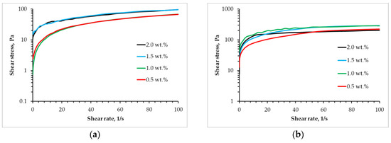 One of the factors that must be considered when determining the possibility of using materials for the implementation of the three-dimensional printing process is the flow type [34]. In order to implement the three-dimensional printing process, it is necessary that the source material be characterized by a pseudo-plastic flow type, which is defined by a decrease in viscosity under the action of shear stresses. The present study investigates the rheological properties of gel materials of varying compositions, with a linear increase in shear rate from 0.01 to 100 s−1. The subsequent analysis of the obtained data resulted in the construction of flow curves (Figure 1).