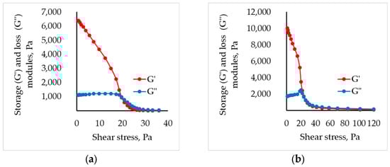 To assess the suitability of the formulated systems for 3D printing, their extrusion flow-onset points were evaluated. This parameter delineates the stress at which the material transitions from an elastically deformable solid to a viscous liquid under shear. The transition is marked by the yield point, defined as the intersection of the storage–modulus and loss-modulus curves.