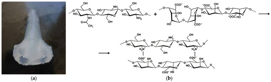 Three-dimensional-printed object based on “alginate–chitosan” solution with 1.5 wt.% concentration of chitosan after gelation process (a); mechanism of polyelectrolyte complex formation (b).
