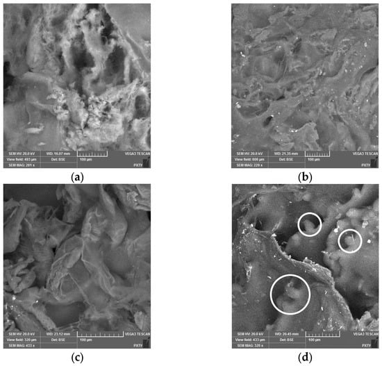 Images of the internal structure of aerogels based on a polyelectrolyte complex with different chitosan content (white circles presumably indicating chitosan particles coated with a polyelectrolyte shell): (a) 0.5 wt.%; (b) 1 wt.%; (c) 1.5 wt.%; (d) 2 wt.%.