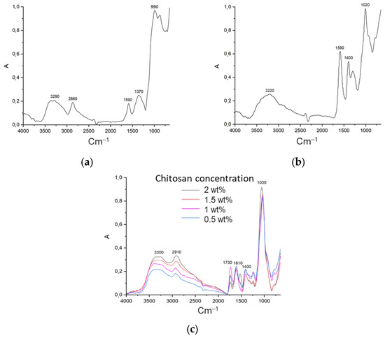 In order to study the formation of the polyelectrolyte complex after the printing process, gelation and drying in a supercritical fluid medium, IR spectroscopy studies were carried out. As illustrated in Figure 5, the IR spectra of the initial sodium alginate and chitosan powders are presented. The spectrum of chitosan displays a broad band ranging from approximately 3000 to 3600 cm−1, indicative of the stretching vibrations of O–H and N–H bonds. The maximum at wave numbers of ∼2860 cm−1 corresponds to the vibrations of the C–H bonds of all hydrocarbon components. The peak observed at 1590 cm−1 is attributed to the overlap of the peaks belonging to the C-O and N-H groups.