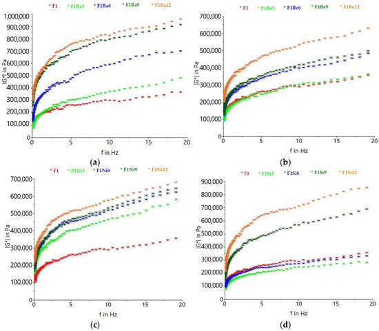 Variation in complex modulus with frequency for durum wheat (F1) dough with different carrot pomace varieties: Baltimore (Ba) (a), Belgrado (Be) (b), Niagara (Ni) (c), and Sirkana (Si) (d), and addition levels (3, 6, 9, and 12%).