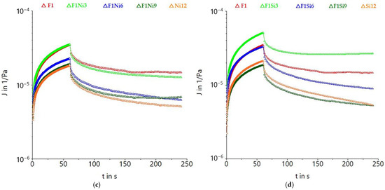 Creep and recovery curves for durum wheat (F1) dough with different carrot pomace varieties: Baltimore (Ba) (a), Belgrado (Be) (b), Niagara (Ni) (c), and Sirkana (Si) (d), and addition levels (3, 6, 9, and 12%).