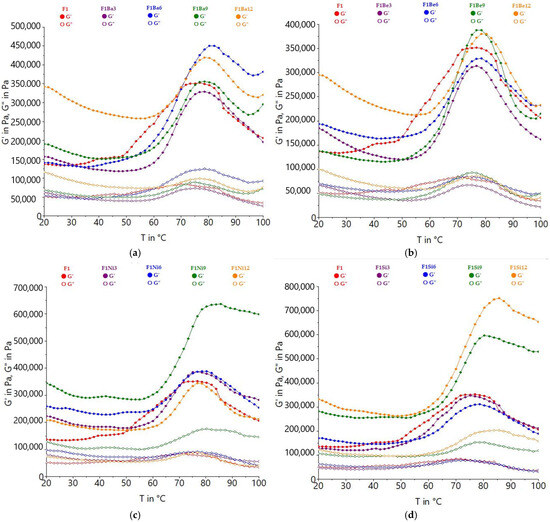Variation in storage (G’) and loss modulus (G’) with temperature for durum wheat (F1) dough with different carrot pomace varieties: Baltimore (Ba) (a), Belgrado (Be) (b), Niagara (Ni) (c), and Sirkana (Si) (d), and addition levels (3, 6, 9, and 12%).