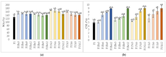 Cooking behavior of pasta: (a) water absorption (WA); (b) cooking solids loss (CSL); a–c—different small letters suggest significant differences (p < 0.05) among carrot pomace varieties; A–D—different uppercase letters suggest significant differences (p < 0.05) among addition levels; Ba—Baltimore, Be—Belgrado, Ni—Niagara, Si—Sirkana, F—durum wheat, 3–12—addition levels.