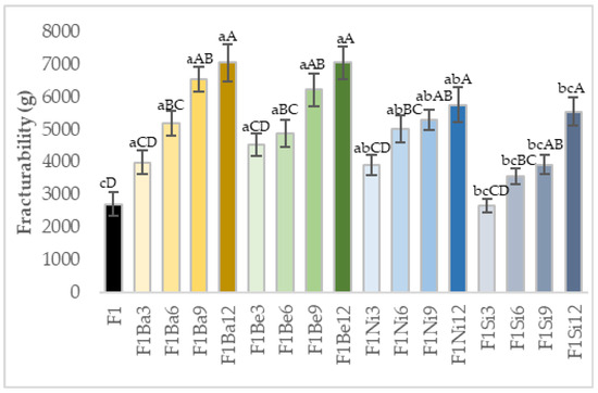 Fracturability of uncooked pasta: a–c—different small letters suggest significant differences (p < 0.05) among carrot pomace varieties; A–D—different uppercase letters suggest significant differences (p < 0.05) among addition levels, Ba—Baltimore, Be—Belgrado, Ni—Niagara, Si—Sirkana, F—durum wheat, 3–12—addition levels.