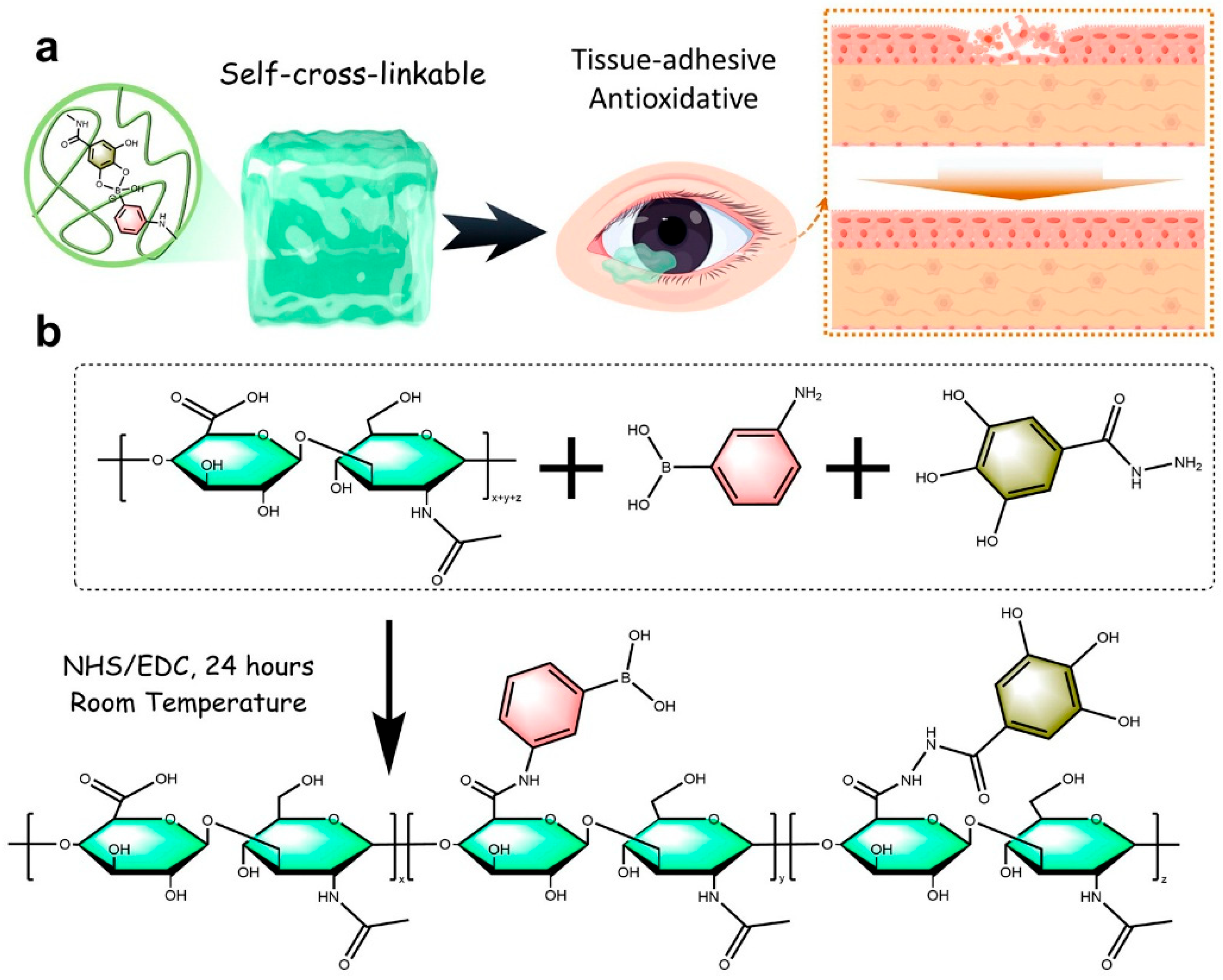 Schematic representations of (a) the HA-GA-PBA hydrogel for corneal epithelial wound healing, exhibiting self-crosslinkable, tissue-adhesive, and antioxidative properties; (b) the synthetic route for HA functionalized with gallol and phenylboronic acid groups [33]. Copyright © 2025, Elsevier.
