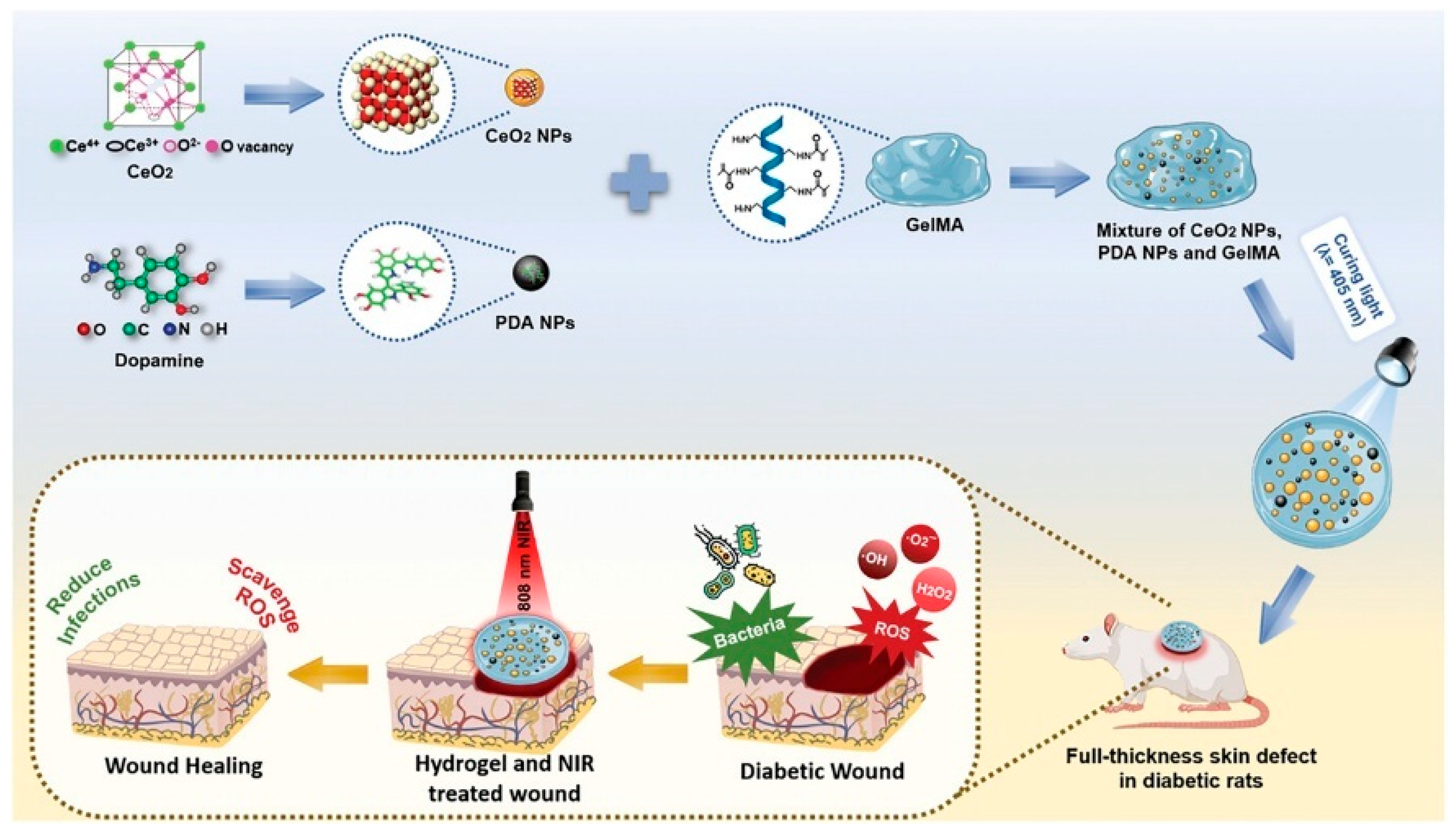 Schematic of NIR-responsive GelMA/CeO2/PDA hydrogel design and preparation, along with its effects on diabetic wound healing [116]. Copyright © 2025, Wiley.