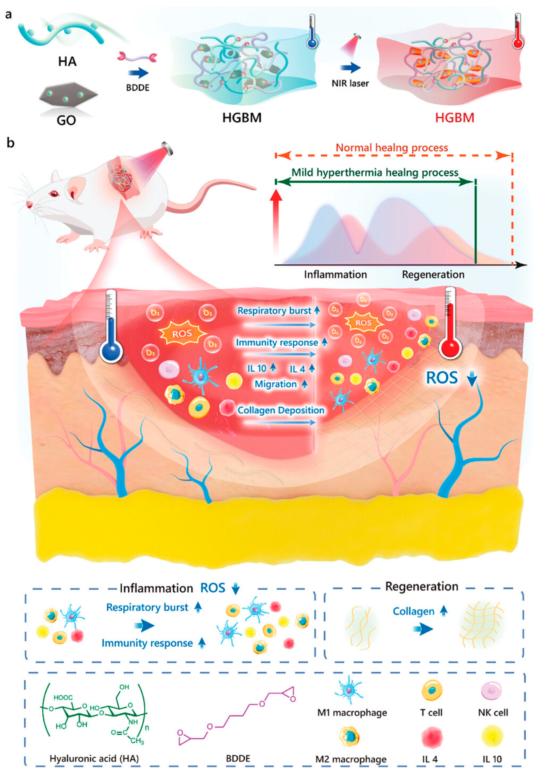 Zhang et al. (2024) developed a graphene oxide-reinforced hyaluronic acid hydrogel (HGBM) that leverages NIR photothermal stimulation to actively modulate immune processes during wound healing (Figure 11) [125]. Under mild hyperthermia (~45 °C) triggered by NIR exposure, the hydrogel induced a transient elevation of ROS, accelerating early immune cell infiltration and initiating a respiratory burst at the wound site. This was followed by a timely resolution of inflammation marked by a higher M2-to-M1 macrophage ratio, evidenced by increased cluster of differentiation 206 (CD206) and decreased inducible nitric oxide synthase (iNOS) expression. In a full-thickness wound model, this immune reprogramming correlated with enhanced re-epithelialization, elevated collagen I deposition, and improved blood perfusion by day 7. Ribonucleic acid (RNA) sequencing further revealed significant upregulation of immunoregulatory genes, including interleukin-4 (IL-4) and IL-10, alongside downregulation of hypoxia-inducible factor-1 (HIF-1) and p53 pathway genes—suggesting a reduction in hypoxic stress. Compared to untreated wounds, which showed delayed immune resolution, HGBM facilitated a faster transition from inflammation to tissue regeneration. This study exemplifies how thermally responsive nanohybrids can precisely orchestrate immune dynamics for accelerated repair in chronic wound environments.
