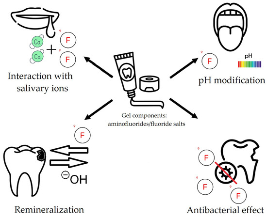 The use of fluoride in dental prophylaxis has been shown to be highly beneficial. The metabolism of plaque bacteria is influenced by fluoride, which has been shown to inhibit enolase activity. This, in turn, reduces the amount of acid produced. It also affects the transport of glucose by bacteria, which blocks the intracellular storage of polysaccharides. The above-mentioned effects result in the inhibition of the growth of cariogenic microorganisms [1,2,3,4]. It is therefore imperative to ensure that the fluoride level in the oral cavity is adequately maintained in order to prevent the occurrence of dental caries. In a water-based environment, fluoride ions diffuse into the inorganic part of the tooth tissues where they react with hydroxyapatite crystals and replace hydroxyl groups, finally leading to the formation of fluorapatite [5], which is more caries-resistant [6,7,8,9]. In comparison with hydroxyapatite, crystals of fluorapatite are more stable in structure, have lower solubility, have superior thermal stability, and are more resistant to acids [3]. Their movement is diffusion-operated (diffusion of fluids into and out of the material and diffusion of fluoride ions into the dental tissues) [10]. In summary, fluoride is indicated as a vital element in maintaining a balance between the demineralization and remineralization of enamel [11]. Furthermore, it has been demonstrated that fluoride exerts antimicrobial properties, chiefly by means of disrupting the metabolism of cariogenic bacteria such as S. mutans. It has been demonstrated to inhibit key bacterial virulence factors, including acid production and glucan synthesis. Nevertheless, the clinical relevance of these antimicrobial effects in vivo remains to be fully elucidated [12]. The multimodal action of fluoride gels in dentistry elaborated above is depicted graphically in Figure 1.