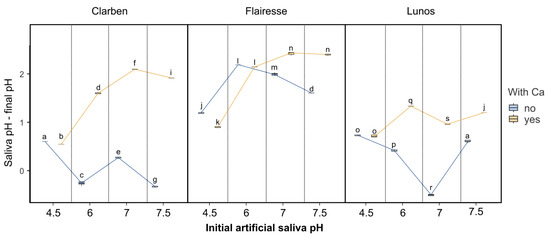 The box plots depict the difference between the initial saliva pH and the pH measured after the gel was applied. Boxes marked with different letters are statistically different (p < 0.01 in the Tukey post hoc test), while those with at least one letter in common are not significantly different. The post hoc test included pairwise comparisons of all possible combinations of initial pH, gels, and the presence of Ca2+.