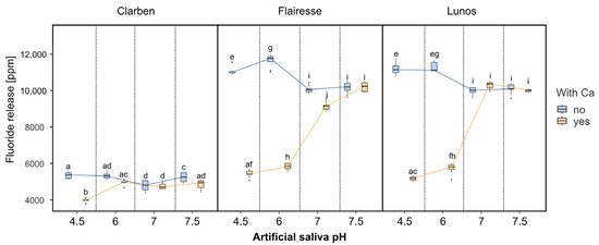 The box plots depict the concentration of fluoride released after gel application. Boxes marked with different letters are statistically different (p < 0.01 in the Tukey post hoc test), while those with at least one letter in common are not significantly different. The post hoc test included pairwise comparisons of all possible combinations of initial pH, gels, and the presence of Ca2+.