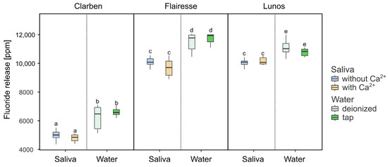 Box plots depicting fluoride release in artificial saliva and water. Boxes marked with different letters are statistically different (p < 0.01 in the Tukey post hoc test), while those with at least one letter in common are not significantly different. The post hoc test included pairwise comparisons of all possible combinations of initial pH, gels, and the presence of Ca2+.