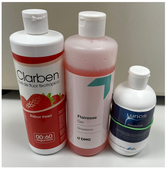 Clarben, Flairesse, and Lunos—commercial fluoride gels evaluated in the study.