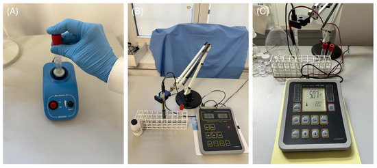 An amount of 0.055 g of each of the three evaluated commercial fluoride gels was placed into five separate polypropylene tubes per gel. Subsequently, 5.5 mL of each solution listed in Table 2 was added to the tubes and mixed using a Bio Vortex V1 (Figure 6A, Biosan, Riga, Latvia), then magnetically stirred at a pace of 500 RPM. The concentration of released F− ions was measured using a 9609 Orion selective electrode (Thermo Scientific, Waltham, MA, USA) connected to a CPI-551 processing unit (Figure 6B, Elmetron, Zabrze, Poland). This measurement was taken immediately after the homogenization process. The mean values of fluoride obtained in the current study are presented in Table S1. The pH of the incubation solutions was measured both before incubation and after the fluoride release assessment using an ESAgP-303W electrode (Eurosensor, Gliwice, Poland) connected to a CPI-505 pH meter (Figure 6C, Elmetron). This assessment was conducted in five replicates for each solution (N = 5). The fluoride release was measured, with each measurement being repeated ten times (N = 10).
