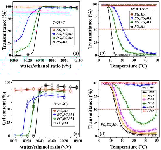 (a) UV-Vis transmittance profile for 10 wt% of EG6MA, EG6PG3MA, PG6EG3MA, and PG5MA monomers at 650 nm against different water/ethanol ratios recorded at room temperature. (b) Transmittance profile at 650 nm for 10 wt% of EG6MA, EG6PG3MA, PG6EG3MA, and PG5MA monomers in water against temperature. (c) Gel content for an absorbed dose of 25 kGy for PEG6MA, PEG6PG3MA, PPG6EG3MA, and PPG5MA hydrogels. (d) Transmittance profile at 650 nm for 10 wt% PG6EG3MA monomers in different water/ethanol ratios. The red horizontal dotted lines highlight the theoretically determined LCST values from the cloud point method.