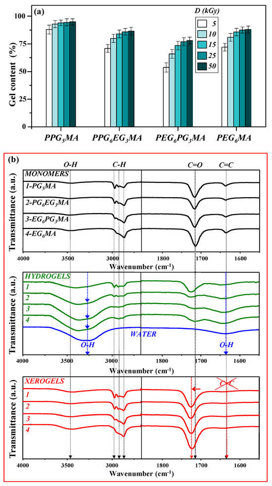 (a) Gel content of PPG5MA, PPG6EG3MA, PEG6PG3MA, and PEG6MA hydrogels as a function of applied absorbed dose; (b) FTIR spectra of monomers/hydrogels/xerogels in the single bond region (3500–2500 cm−1) and double bond region (2000–1500 cm−1). The scans were shifted vertically for clarity.