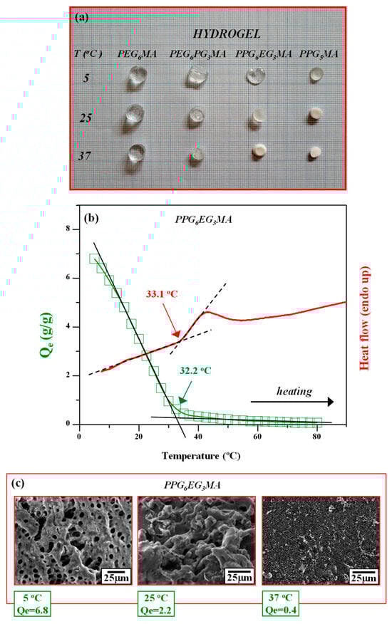 To emphasize the thermoresponsive nature of MA networks with pendant EGPG terminals, the swelling behavior and DSC heating scan (thermogram) of the obtained PPG6EG3MA hydrogel are shown in Figure 3b. The onset of the endothermic peak in the DSC curve corresponds to the VPTT, i.e., the temperature at which the hydrogel network begins to undergo dehydration and collapse [47,48].