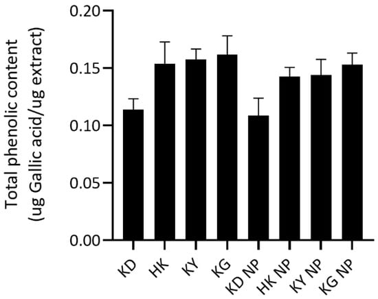 The total phenolic content (TPC) of each extract and its corresponding NPs formulation was quantified and expressed in micrograms of gallic acid equivalents per microgram of extract (µg GAE/µg extract) (Figure 1). Among the crude extracts, KG exhibited the highest TPC (0.1616 ± 0.0164 µg GAE/µg extract), followed by KY (0.1576 ± 0.0089), HK (0.1537 ± 0.0192), and KD (0.1138 ± 0.0094). A similar trend was observed in NP formulations, with the highest TPC observed in KG NP (0.1529 ± 0.0102), followed by KY NP (0.1439 ± 0.0137), HK NP (0.1426 ± 0.0079), and KD NP (0.1084 ± 0.0154). The statistical analysis revealed that KD had a significantly lower TPC compared to HK, KY, and KG, as well as significantly lower than KG NP.