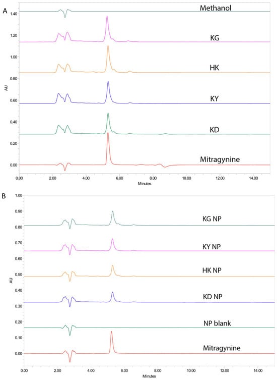 Representative HPLC chromatograms of mitragynine in kratom samples (A), crude extracts (KD, HK, KY, KG), and mitragynine standard (40 ppm), and (B) corresponding NP formulations and blank formulation (NP blank). Mitragynine was consistently detected at a retention time of 5.2–5.3 min.