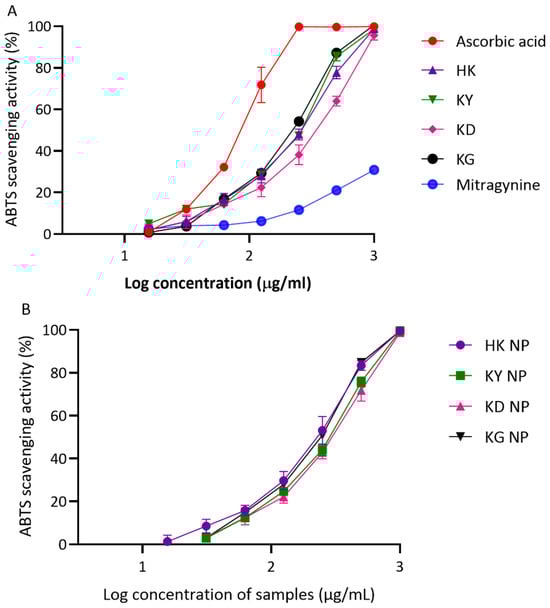 ABTS radical scavenging activity of kratom extracts and their NP formulations. (A) Antioxidant activity of crude extracts (HK, KY, KD, and KG) compared with ascorbic acid (positive control). (B) Antioxidant activity of NP formulations (HK NP, KY NP, KD NP, and KG NP). Results are presented as percentage inhibition of ABTS versus log concentration (µg/mL). Data are expressed as mean ± SD (n = 3).