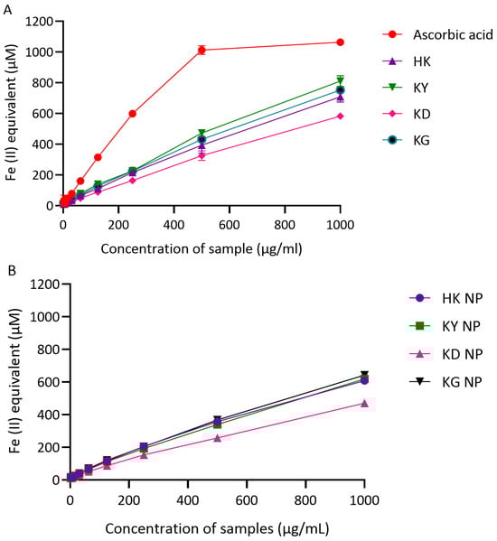 Ferric reducing power (FRAP) of kratom extracts and their corresponding NP formulations. (A) Reducing capacity of crude extracts (HK, KY, KD, and KG) compared with ascorbic acid (positive control), expressed as Fe(II) equivalents (µM). (B) Reducing capacity of NP formulations (KD NP, HK NP, KY NP, and KG NP). Results are shown as mean ± SD (n = 3).