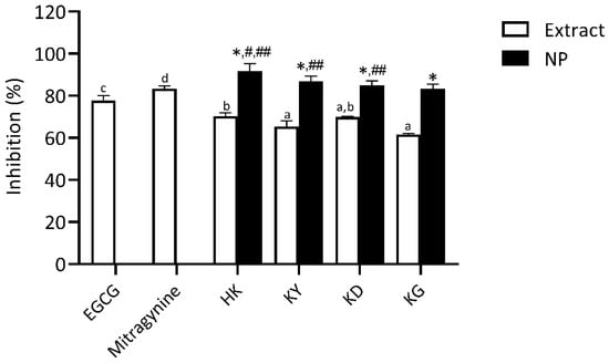 Hyaluronidase inhibitory activity of kratom leaf extracts and their NP formulations compared to epigallocatechin gallate (EGCG) and mitragynine. All samples were tested at a concentration of 1 mg/mL. Bars represent mean ± SD (n = 3). Different letters indicate significant differences among extracts (p < 0.05, one-way ANOVA with Tukey’s test). Symbols from pairwise t-tests (p < 0.05): * vs. corresponding extract; # vs. mitragynine; ## vs. EGCG.