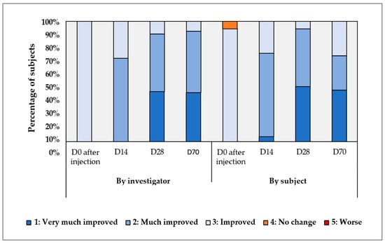 Overall, investigator assessments indicated that 100% of participants exhibited improvement as early as after the first product injection (Day 0), with these improvements sustained through Day 70. Regarding self-assessments, while three participants did not report improvement immediately after the first product injection, 100% of participants reported improvement from Day 14 onward. Four weeks post initial injection, 100% of participants (48/48) treated with Hydragel A1 were rated as improved by the investigator according to the GAIS. This proportion was significantly different from 40% (i.e., p-value < 0.001, Table S2). Furthermore, when investigator and subject evaluations were combined, the lower confidence interval for the proportion of participants showing improvement ranged from 85% to 94%. Overall, the proportion of recorded clinical success was significantly greater than 0.4 at all timepoints.