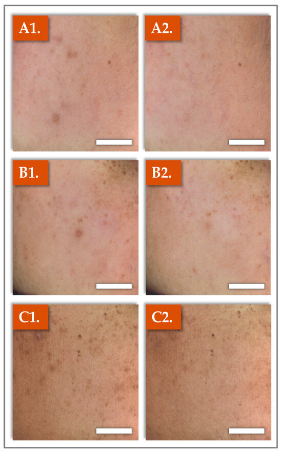 Images from three selected study patients, showing a visible improvement of skin radiance (i.e., from left [D–3], pre-baseline to right [D70]), both in terms of spot intensity and size of the dark spots. (A1,A2) Patient N° 17. (B1,B2) Patient N° 19. (C1,C2) Patient N° 26. Scale bars = 10 mm.