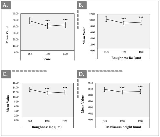 Clinical monitoring results using the Antera 3D device. (A) Texture score evolution. (B) Roughness “Ra” parameter evolution. (C) Roughness “Rq” parameter evolution. (D) Maximum height evolution. Error bars = 95% confidence interval. Statistical significance (i.e., p-value ≤ 0.001) was evidenced by three asterisks (***). Detailed statistical analysis results are reported in Table S3.