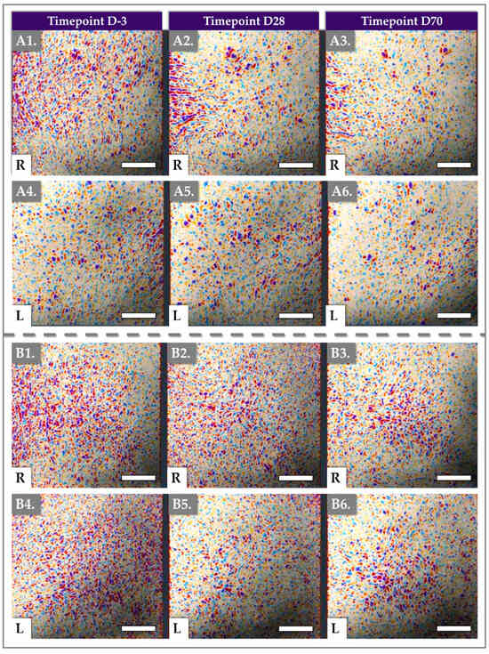 Results of Antera 3D imaging at various timepoints of the clinical study. (A1–A3) Imaging of the right cheek for patient N° 4. (A4–A6) Imaging of the left cheek for patient N° 4. (B1–B3) Imaging of the right cheek for patient N° 37. (B4–B6) Imaging of the left cheek for patient N° 37. Scale bars = 5 mm. R = right, L = left.