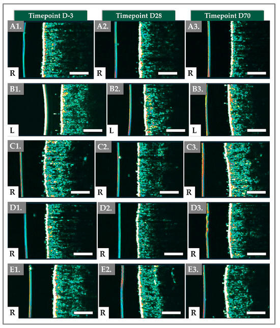Results of DermaScan imaging at various timepoints of the clinical study. (A1–A3) Imaging of the right cheek for patient N° 15. (B1–B3) Imaging of the left cheek for patient N° 24. (C1–C3) Imaging of the right cheek for patient N° 26. (D1–D3) Imaging of the right cheek for patient N° 30. (E1–E3) Imaging of the right cheek for patient N° 43. Scale bars = 2 mm. R = right, L = left.